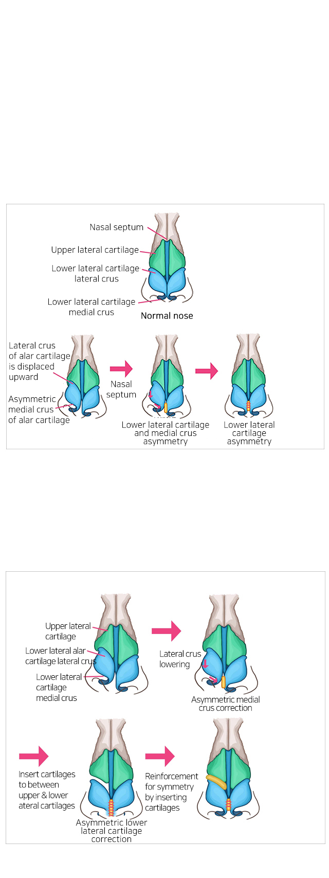 In case of correcting uneven nostrils through rearrangement of lower lateral alar cartilages, it is necessary to lower the nostrils by intercartilaginous graft, in order to strongly lower and stabilize the lower lateral cartilages.