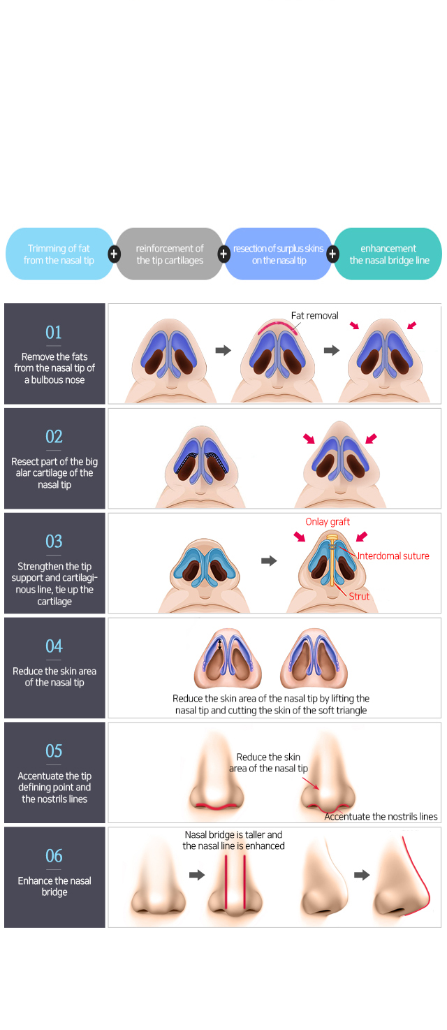 In order to create a sharp and slim nasal tip, a surgeon must thin the skins of the nasal tip and Reinforce the supporting structure of the nasal tip. By doing so, the defining point of the nasal tip will be enhanced to become a sharp nasal tip. Moreover, reshaping the skin on the nasal tip will generate a synergistic effect of a small nasal tip in combination with a sharp nostrils line.